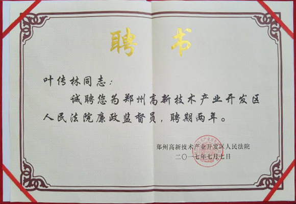 2017年7月7日,郑州高新技术产业开发区人民法院举行廉政监督员颁证仪式,信念集团董事长叶传林同志被聘为郑州高新技术产业开发区人民法院廉政监督员,聘期两年。对此,我们表示热烈祝贺。